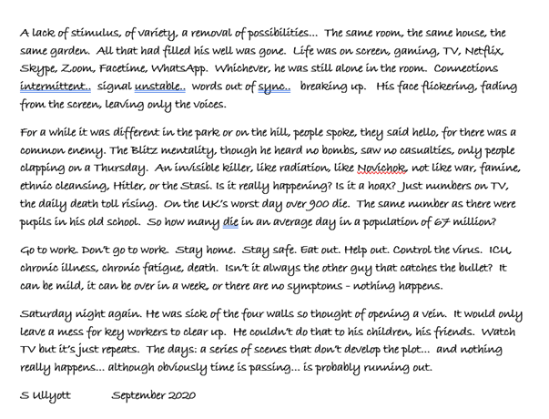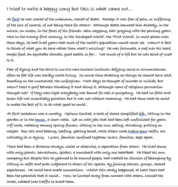 Meeting up with my school pal, Stewart online we have finally been able to fulfil the ambition to work together on a joint venture. It is not exactly a song, both of us have slightly different aspirations now. Stewart, being involved in a local writers’ group that had continued meeting on Zoom, wrote a short piece about the Lockdown. I had been helping advise him on upgrading his laptop and coaching him in how to use Windows 10. I had just finished making a music CD called Lockdown Diaries. Meeting up regularly using Skype we had an opportunity to share in each other’s creative efforts. I really enjoyed Stewart’s Lockdown piece and thought it might be good to use it has a basis for a soundscape, like a short radio play, or poem. I introduced Stewart to the open-source program Audacity, as a way of recording a reading of his Lockdown piece. Audacity is free and simple to use and there are plenty of file formats available for saving recordings and sharing them without losing the quality of the original recording.